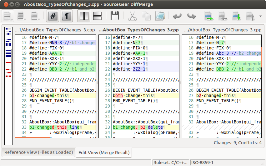 Graphically shows the changes between 3 files. Allows automatic merging (when safe to do so) and full control over editing the resulting file.