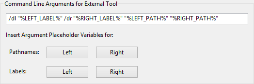 Since each external application seems to have its own unique argument ordering and command flags, we define the command line arguments using a template containing place-holder tokens. When DiffMerge is ready to launch the external application, it will substitute pathnames and labels into the template and build the actual command line.