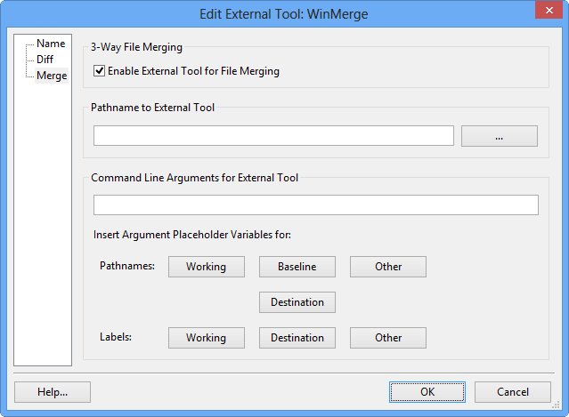 The Merge Page of the Add/Edit External Tool Dialog lets you configure the tool to be used for File Merges.