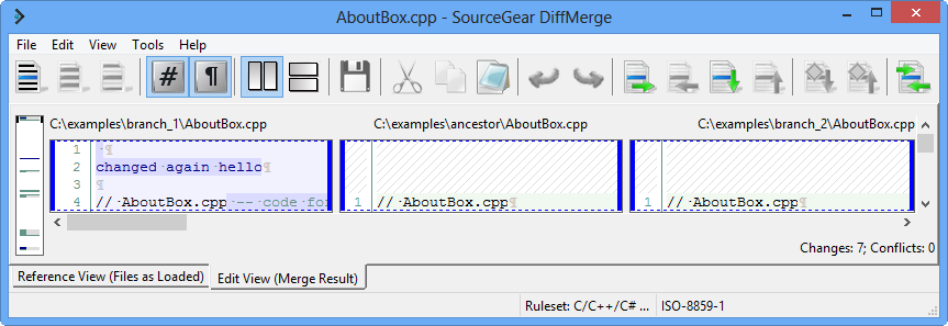 The second is a three-way window that shows the differences between three files; typically this is a common ancestor (in the middle) and two branches that have independently evolved (on the left and right). You can use this window to see the changes side-by-side-by-side. You can edit the center file and merge in changes from both branches, creating a common/unified version.