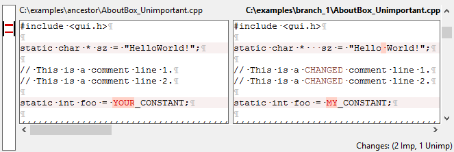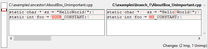 When the Display Mode is set to Show All, the View | Hide Unimportant Differences command causes DiffMerge to draw them as if they were identical (and with a slightly dimmer color for intra-line character changes). In the following example, the 2 comment lines are no longer highlighted. And the word “CHANGED” is dimmed slightly. The glance bar no longer shows a block for the change. The whitespace before “sz” is no longer highlighted. The Change Stats shows that there are 2 important changes and 1 unimportant change (not being shown).