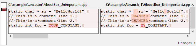 When the Detail Level is set to Lines and Characters, DiffMerge classifies all changes as either important or unimportant using the information in the Ruleset. Normally, DiffMerge draws these unimportant changes in a dimmer color. In the following example, compare the coloring of the “CHANGED” and “YOUR/MY” changes in the file panel and in the glance bar. Also, the Change Stats shows that there are 3 changes.
