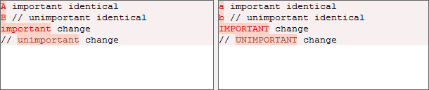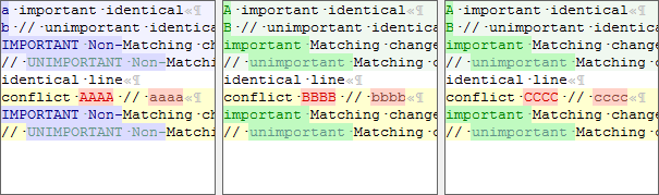 In Lines and Characters mode, DiffMerge performs line-by-line difference analysis and then within each change block it performs intra-line difference analysis.