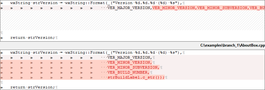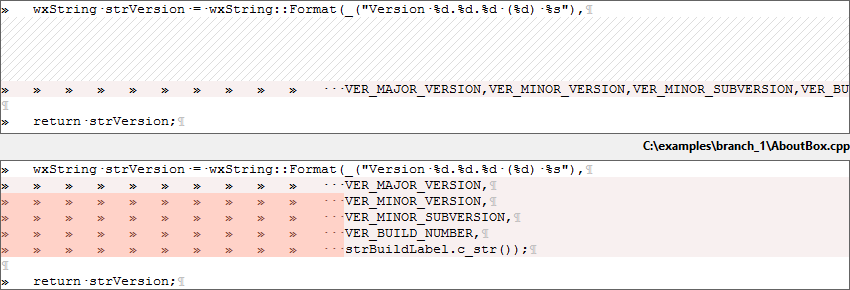 For example, the following images show where a line of source code was broken across several lines in one version. When in Simple or Complete mode, only the whitespace is highlighted because DiffMerge matches up the words by crossing the line boundaries.