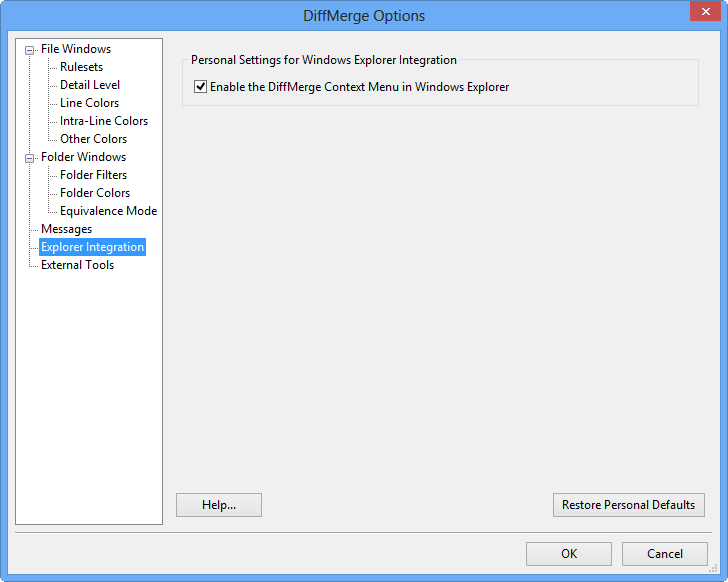 The Explorer Integration Page lets you control the DiffMerge integration with Windows Explorer. This feature allows DiffMerge to add commands to the context menu of Windows Explorer. These commands allow Windows Explorer to launch DiffMerge with the selected file(s) and folder(s).
