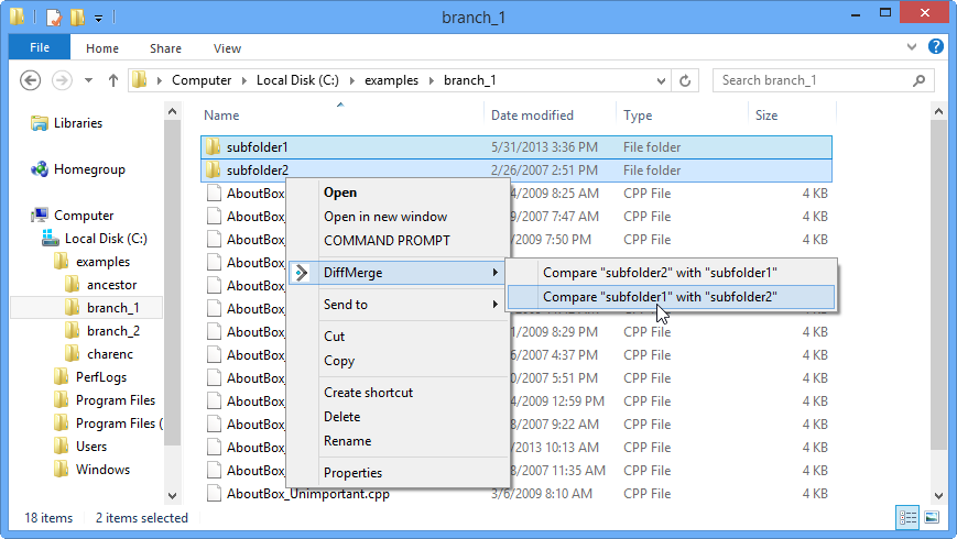 When Explorer Integration is enabled, DiffMerge will (when appropriate) add a pop-up context menu to the Windows Explorer context menu.