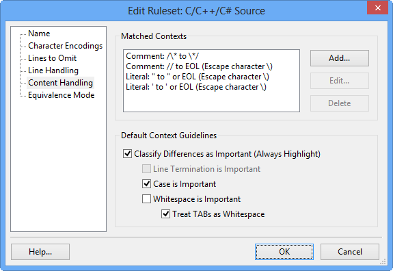 The Content Handling Page of the New/Edit Ruleset Dialog lets you tell DiffMerge about the various contexts, such as string literals and comments, within a file. DiffMerge can use this information to classify changes as important or unimportant.