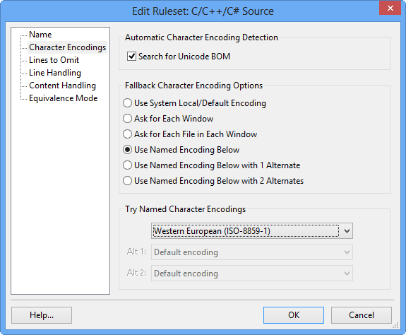 The Character Encodings Page of the New/Edit Ruleset Dialog lets you specify the character encoding for files handled by this Ruleset.