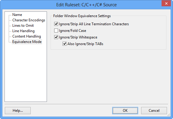 The Equivalence Mode Page of the New/Edit Ruleset Dialog lets you control what differences are ignored in Folder Diff Windows when the Equivalence Mode is set to Ruleset-based.