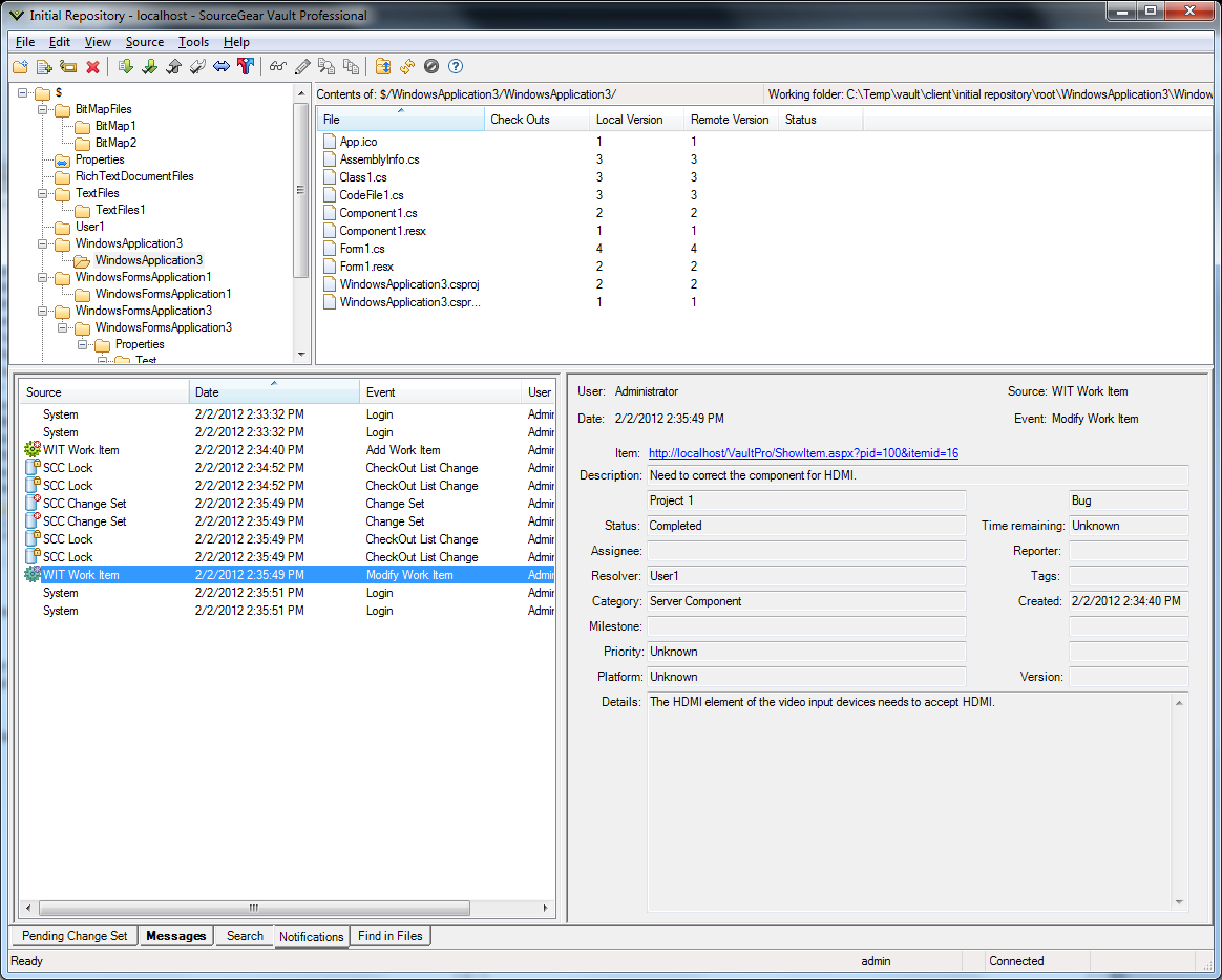 - Event Notifications - In addition to Email Notifications already in the product, Vault 6.0 will display updates to the source control repository and work items directly within Visual Studio, Eclipse, and the stand-alone GUI client. Developers will be kept informed in real-time of changes made by their team without having to leave their development environment.