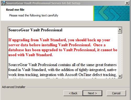 If you're upgrading from Vault Standard to Vault Professional, you should back up - but not delete - your databases before installing Vault Professional. You must uninstall Vault Standard before installing Vault Professional. Click here for additional details on upgrading from Vault Standard to Vault Professional.