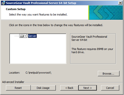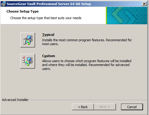This screen gives you the option of choosing a Typical or Custom setup. The "Custom" option allows you to choose the Vault installation directory; Typical chooses the install location automatically, generally C:\inetpub\wwwroot.
