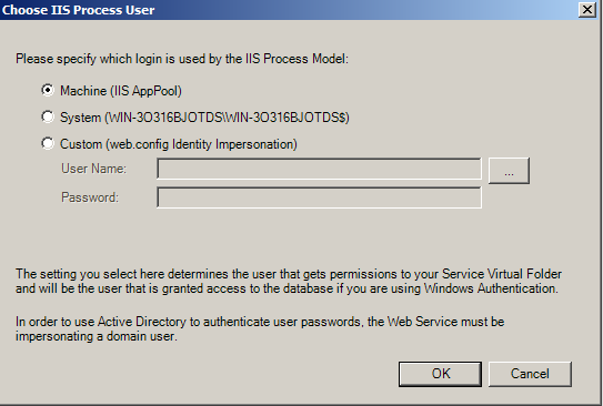 However, if your SQL Server is on a different machine, and you want to use Windows Authentication, then the account you choose for the IIS Process Model should not be the machine account, as that only exists on the local machine. In this case, choose a custom account. The custom account needs to be a Windows account which has access to both the SQL Server and the IIS Server, usually a DOMAIN\USER account.