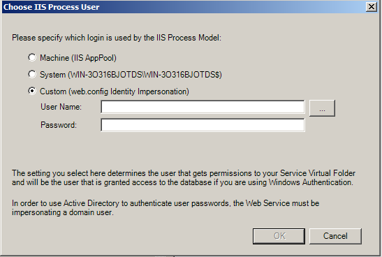 The Custom option allows you to specify a local or domain Windows user for the IIS Process User. Use a custom account when SQL Server is located on a different machine than the Vault Server, and you want to use Windows Authentication to connect to SQL Server. You should use an account which is accessible by both machines - specifically a domain account - DOMAIN\USER.