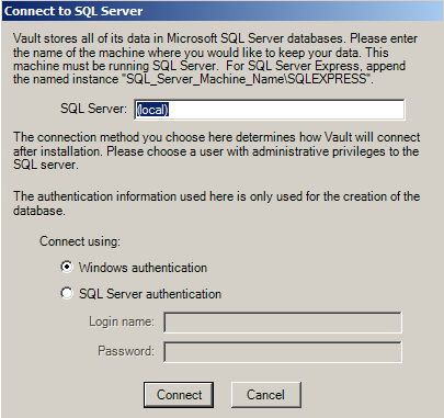 You will decide whether to use Windows Authentication or SQL Server Authentication for access to the Vault databases by the Vault process. Be sure your SQL Server is set up to accept the type of authentication you choose.
