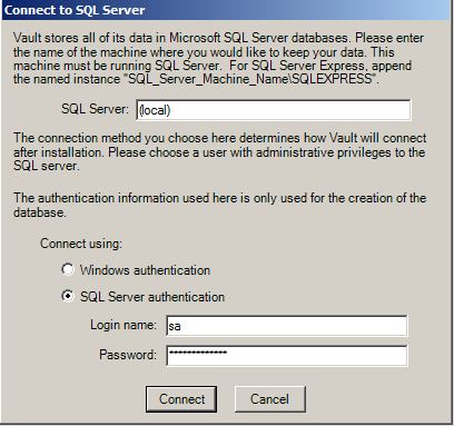 The Vault Server can connect to SQL Server via Windows Authentication or SQL Server Authentication. If you choose SQL Server Authentication, please verify SQL Server is set up to allow SQL Server Authentication