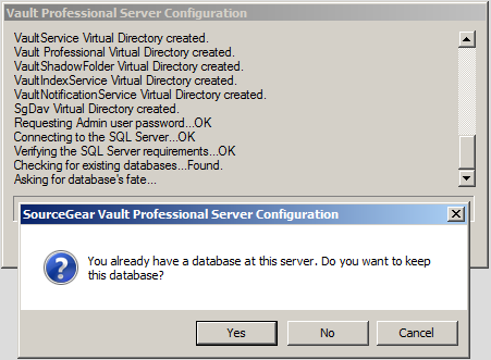 The server installation is complete when the status message says "Completing the SourceGear Vault Professional Server Setup Wizard." If you wish to install the Vault Pro Client, check the "Install the Vault Professional Client" checkbox before pressing OK. The client installer will begin.