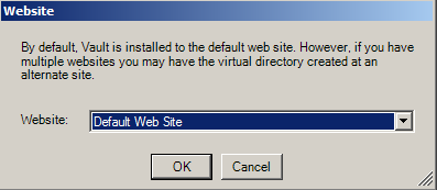 The first step is installing the Vault virtual directory. By default, Vault is installed to the IIS Default Website. However, the Vault installation program will detect whether you have more than one website configured. If you do not want the virtual directory installed the Default Web Site, make a selection from the other web sites listed in the combo box.