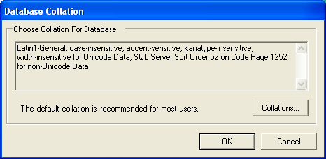 Choose Collation for Database. This dialog appears when there are no existing databases. The collation determines how the database sorts text strings in the database, based on the language used. The Vault installer chooses a collation that is appropriate based on the language settings of the machine. If you wish to choose a different collation, click Collations... and select the one you want.